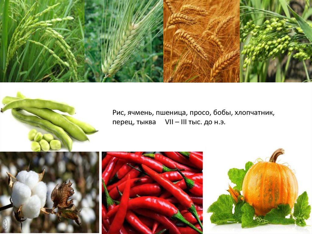 Рис, ячмень, пшеница, просо, бобы, хлопчатник,перец, тыква VII – III тыс. до н.э.