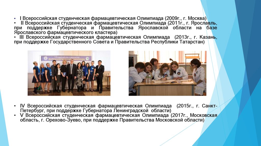 I Всероссийская студенческая фармацевтическая Олимпиада (2009г., г. Москва)• II Всероссийская студенческая фармацевтическая Олимпиада (2011г., г. Ярославль,