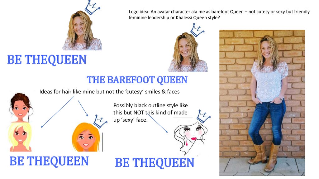 Logo idea: An avatar character ala me as barefoot Queen – not cutesy or sexy but friendlyfeminine leadership or Khalessi Queen style?