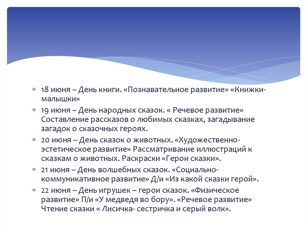 18 июня – День книги. «Познавательное развитие» «Книжкималышки»19 июня – День народных сказок. « Речевое развитие»