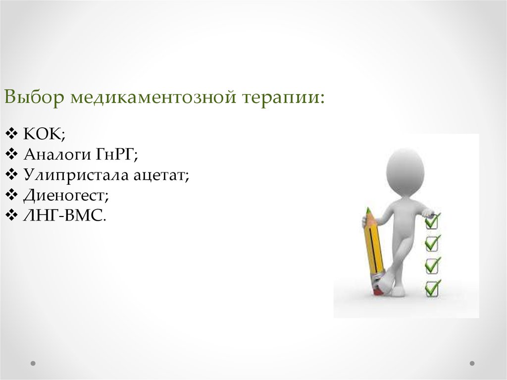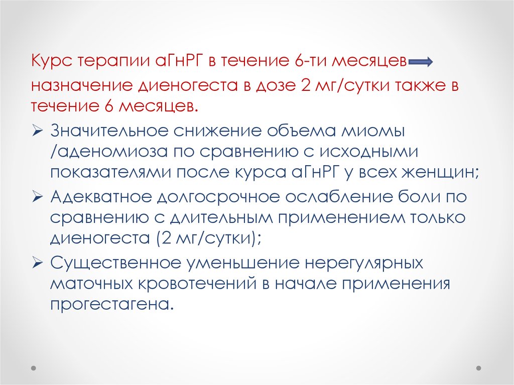 Курс терапии аГнРГ в течение 6-ти месяцевназначение диеногеста в дозе 2 мг/сутки также в
