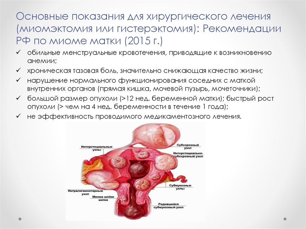 Основные показания для хирургического лечения(миомэктомия или гистерэктомия): Рекомендации