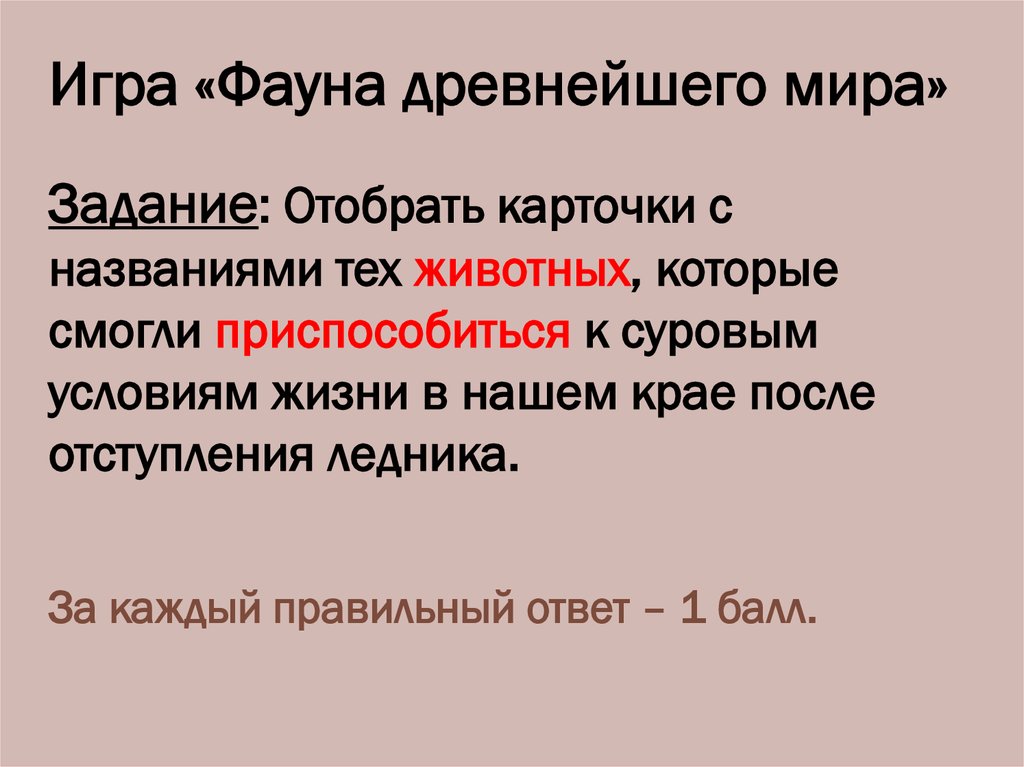Игра «Фауна древнейшего мира»Задание: Отобрать карточки с