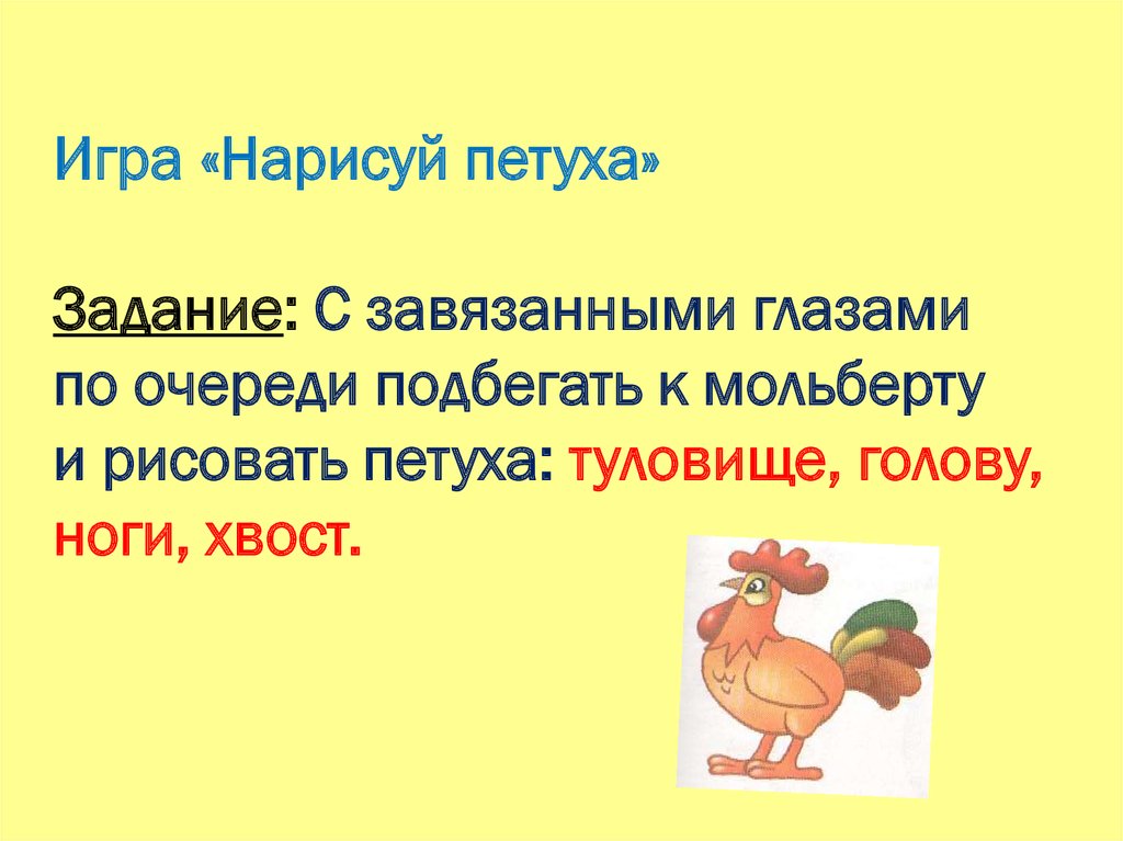 Игра «Нарисуй петуха»Задание: С завязанными глазами