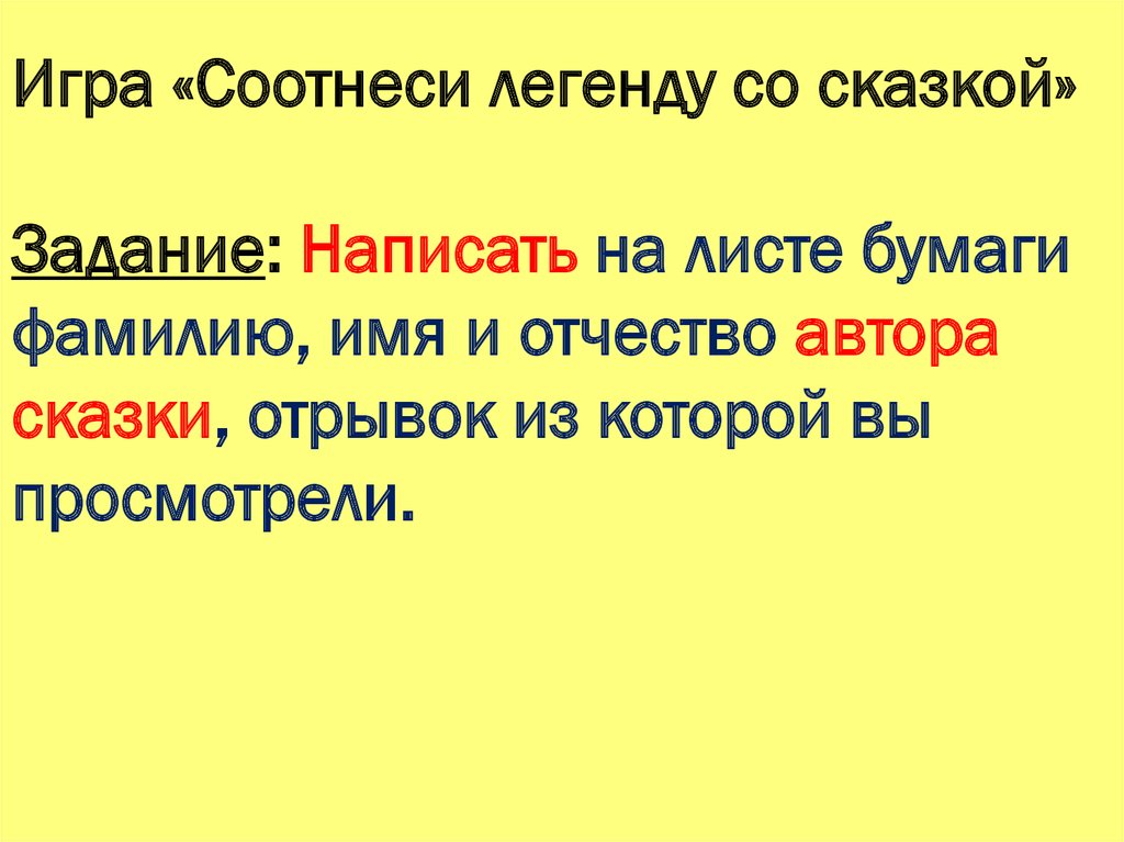Игра «Соотнеси легенду со сказкой»Задание: Написать на листе бумаги