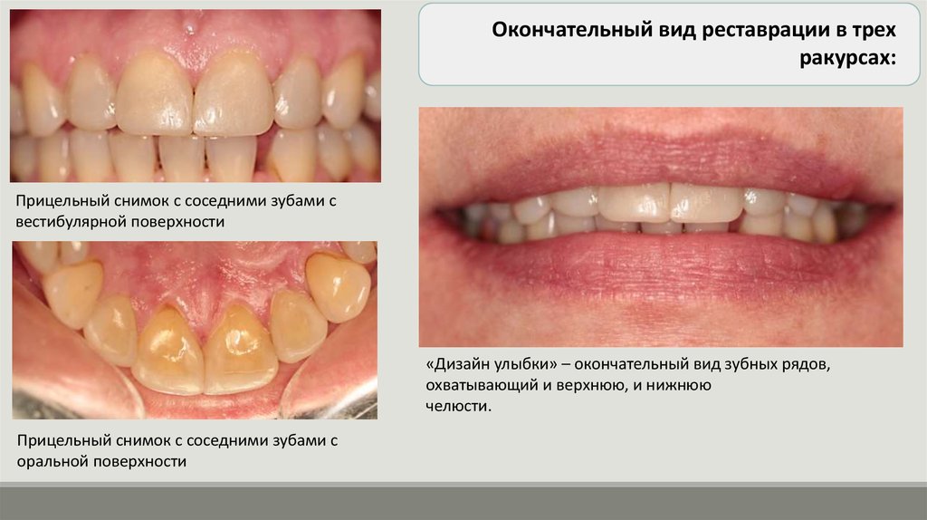 Восстановлена «арка улыбки». Цвет реставрации соответствует цвету зуба, материал плотно прилегает к тканям