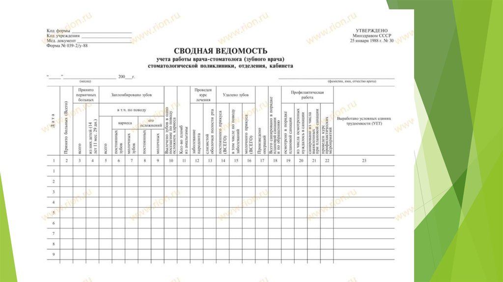 ЛИСТОК ЕЖЕДНЕВНОГО УЧЕТА РАБОТЫ ВРАЧА - СТОМАТОЛОГА (ЗУБНОГО ВРАЧА) СТОМАТОЛОГИЧЕСКОЙ ПОЛИКЛИНИКИ, ОТДЕЛЕНИЯ, КАБИНЕТА....______________ 19... г.