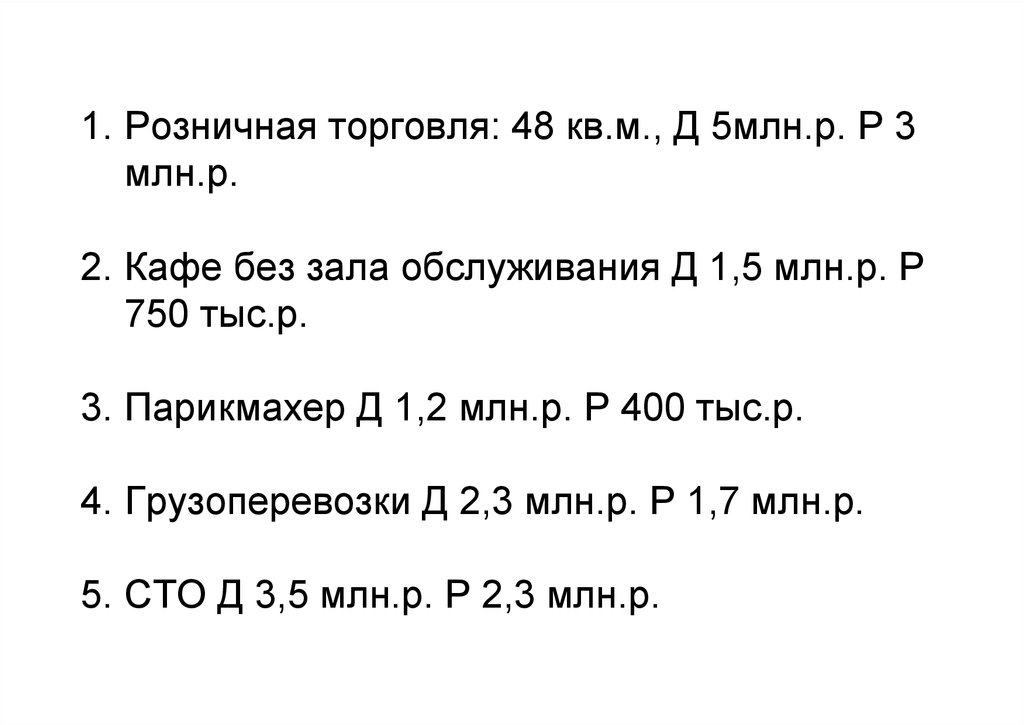1. Розничная торговля: 48 кв.м., Д 5млн.р. Р 3млн.р.