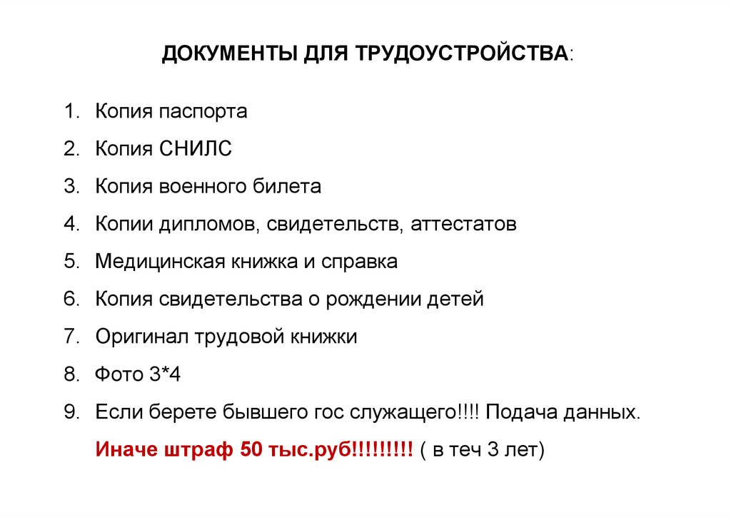 ДОКУМЕНТЫ ДЛЯ ТРУДОУСТРОЙСТВА:1. Копия паспорта