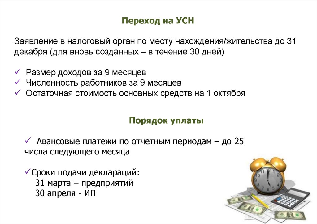 Переход на УСНЗаявление в налоговый орган по месту нахождения/жительства до 31