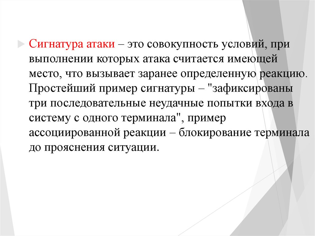 Сигнатура атаки – это совокупность условий, привыполнении которых атака считается имеющей