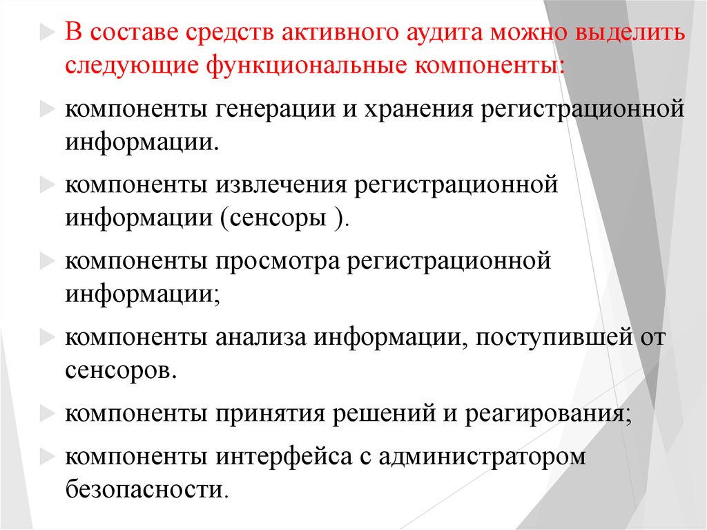 В составе средств активного аудита можно выделитьследующие функциональные компоненты: