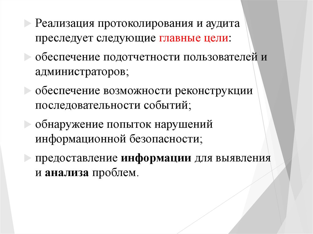 Реализация протоколирования и аудитапреследует следующие главные цели: