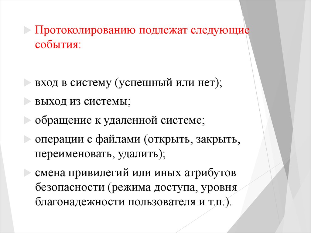 Протоколированию подлежат следующиесобытия: