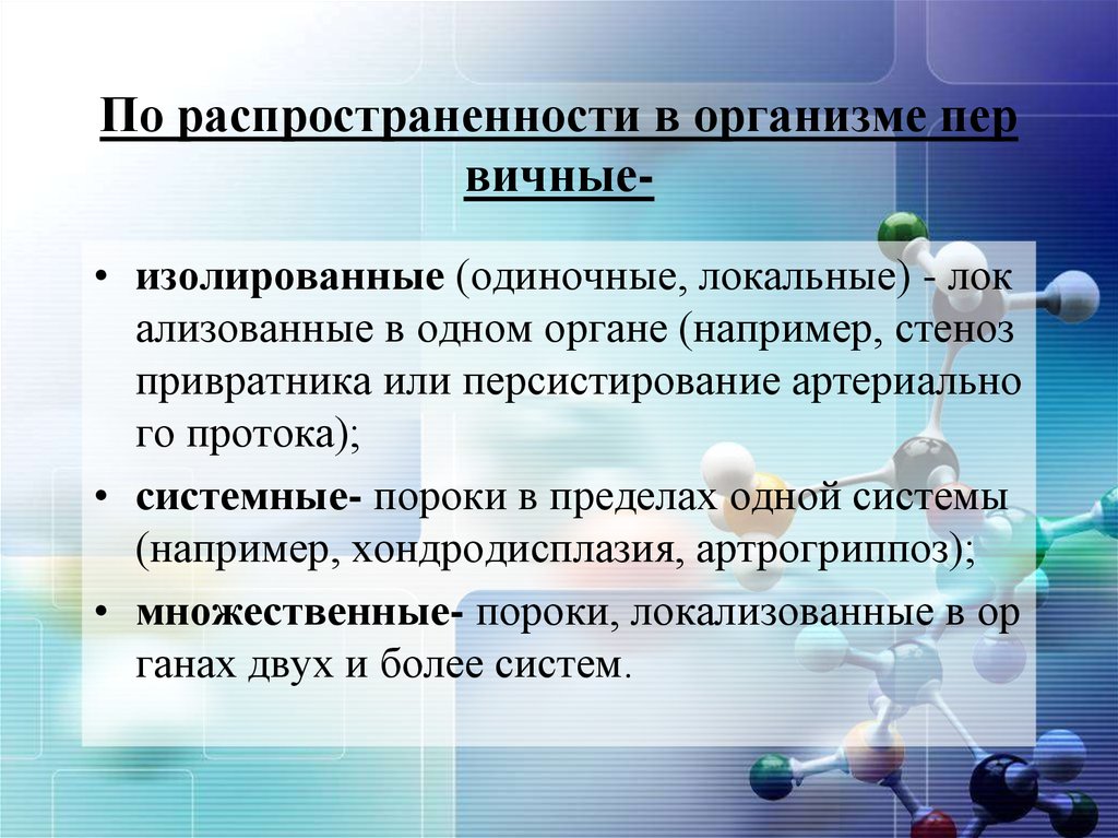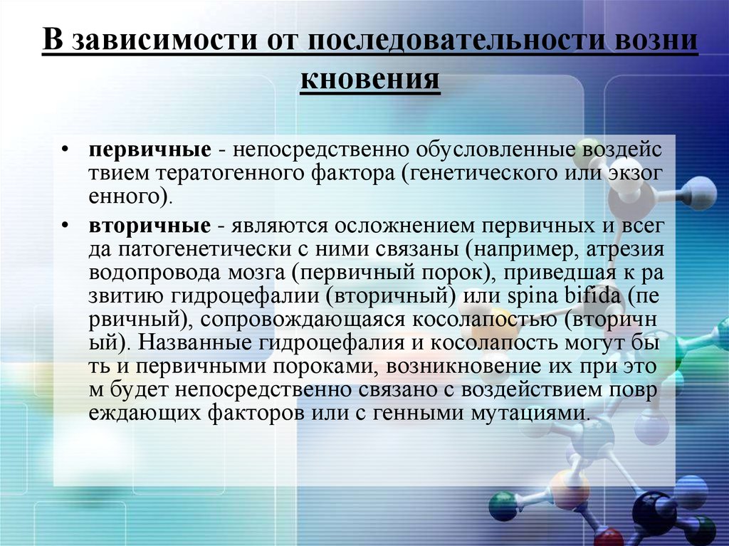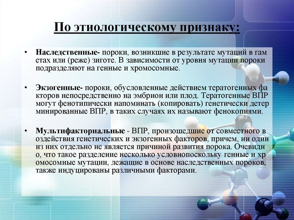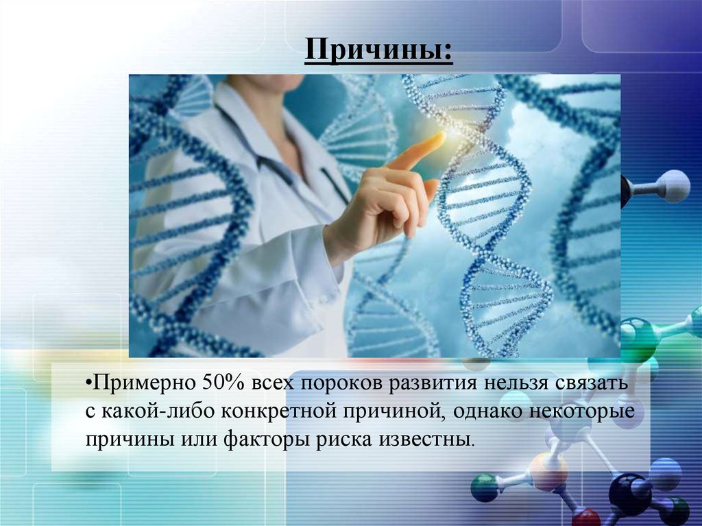 Причины:•Примерно 50% всех пороков развития нельзя связать