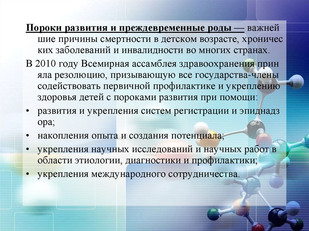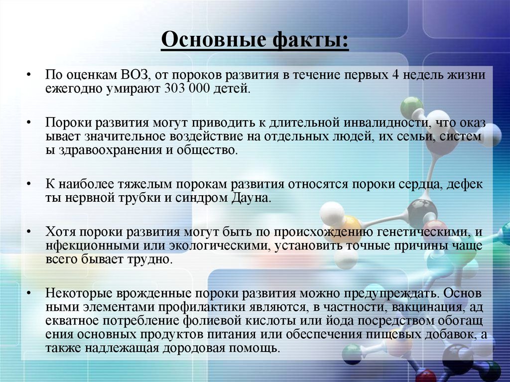 Основные факты:• По оценкам ВОЗ, от пороков развития в течение первых 4 недель жизни