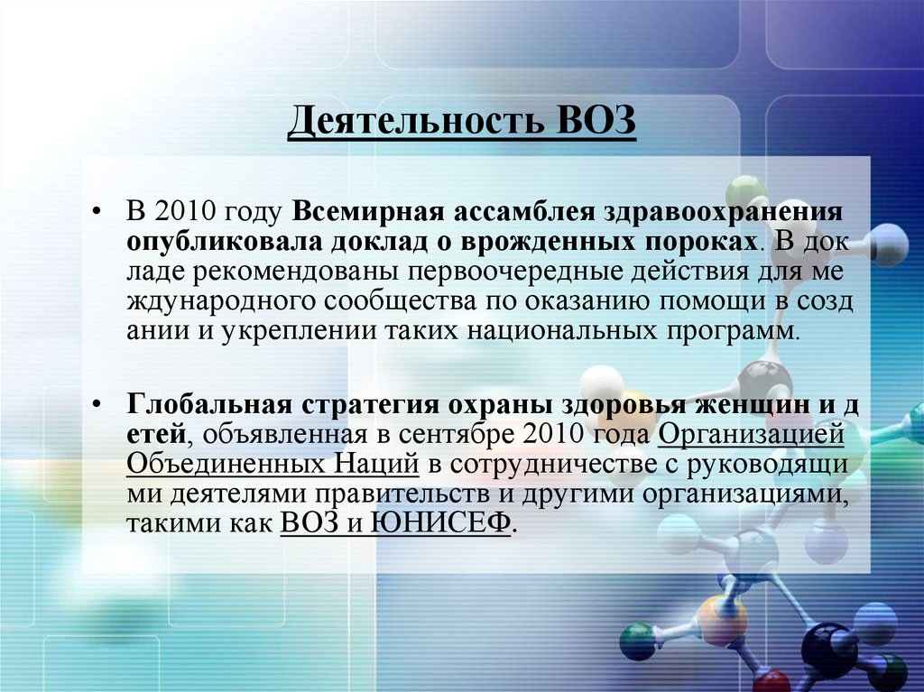 Деятельность ВОЗ• В 2010 году Всемирная ассамблея здравоохранения