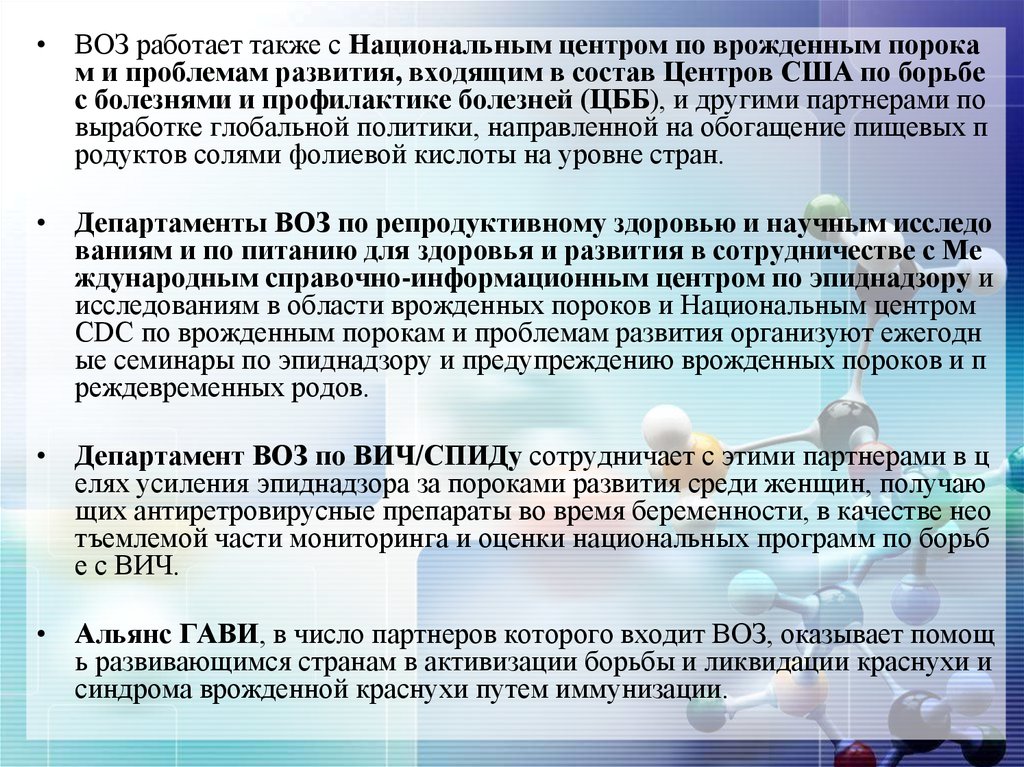 • ВОЗ работает также с Национальным центром по врожденным порокам и проблемам развития, входящим в состав Центров США по борьбе
