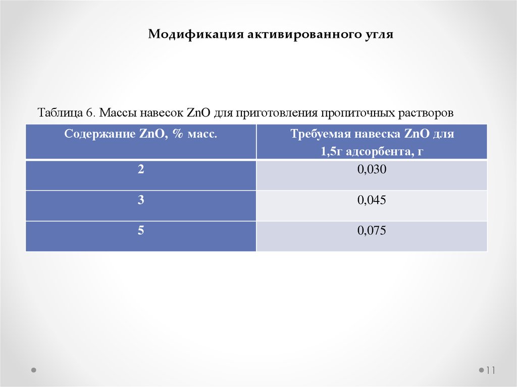 Модификация активированного угляТаблица 6. Массы навесок ZnO для приготовления пропиточных растворов