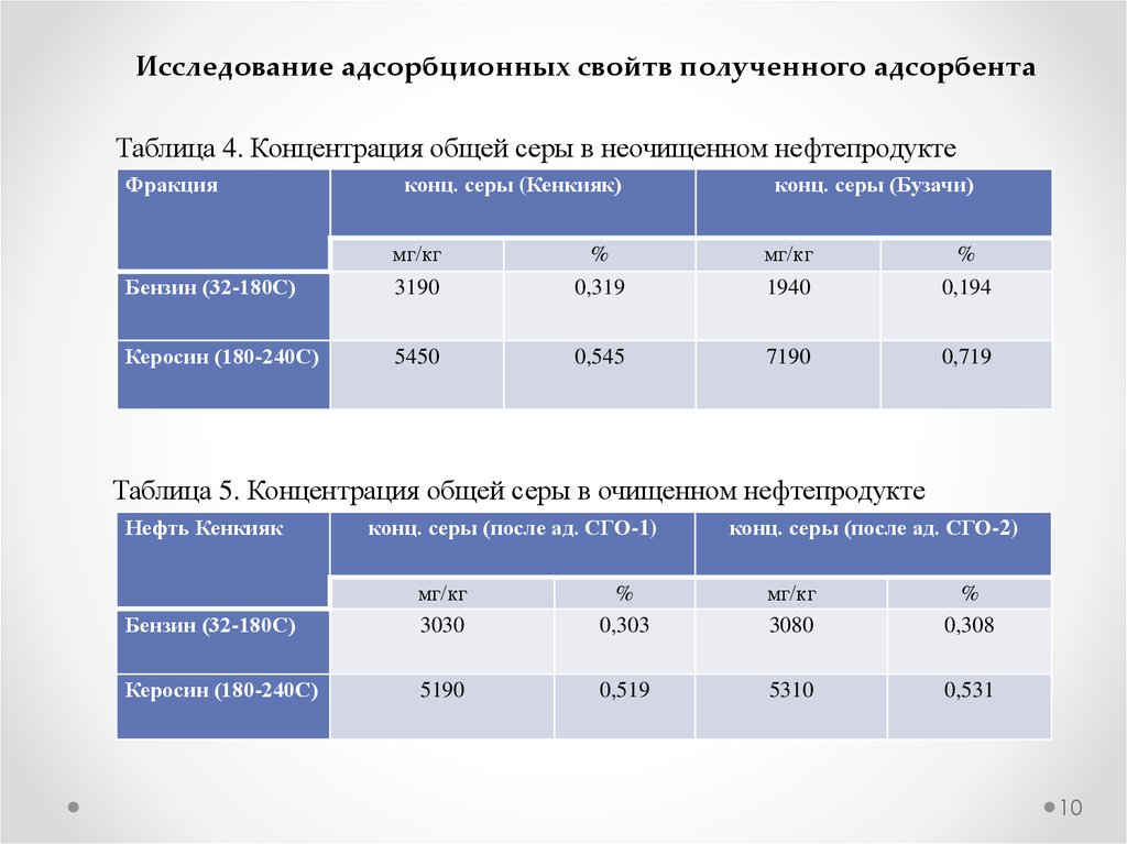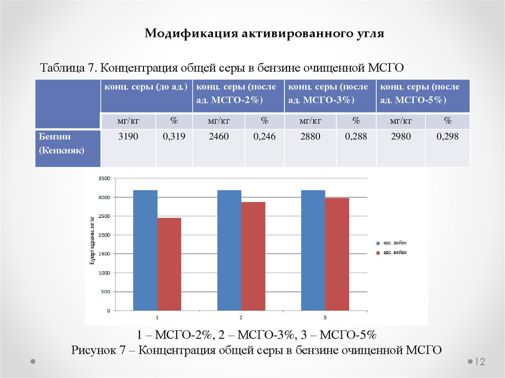 Модификация активированного угляТаблица 7. Концентрация общей серы в бензине очищенной МСГО