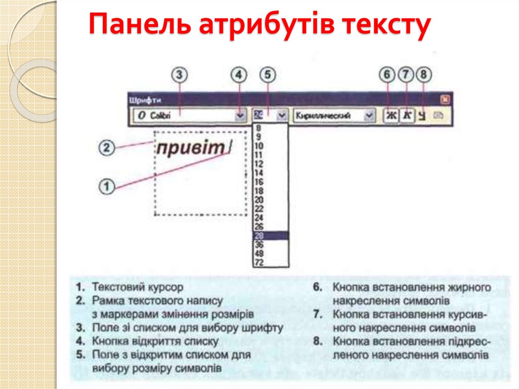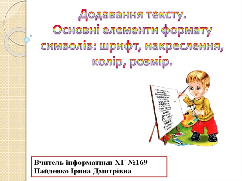 1. Додавання тексту. Основні елементи формату символів: шрифт, накреслення, колір, розмір.
