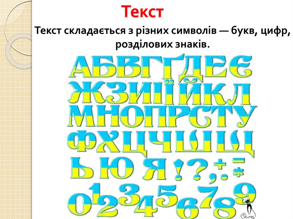 Текст складається з різних символів — букв, цифр,розділових знаків.