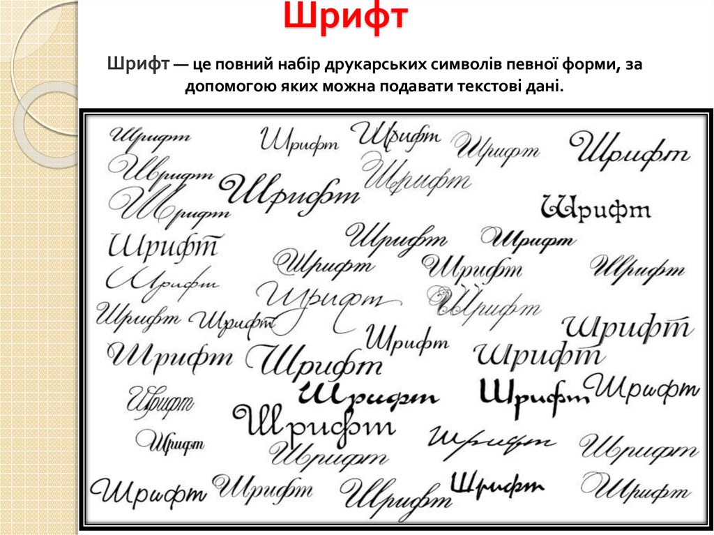 Шрифт — це повний набір друкарських символів певної форми, задопомогою яких можна подавати текстові дані.