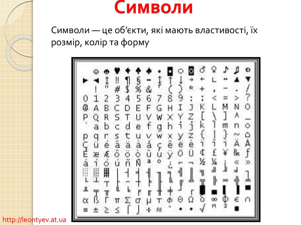 Символи — це об’єкти, які мають властивості, їхрозмір, колір та форму