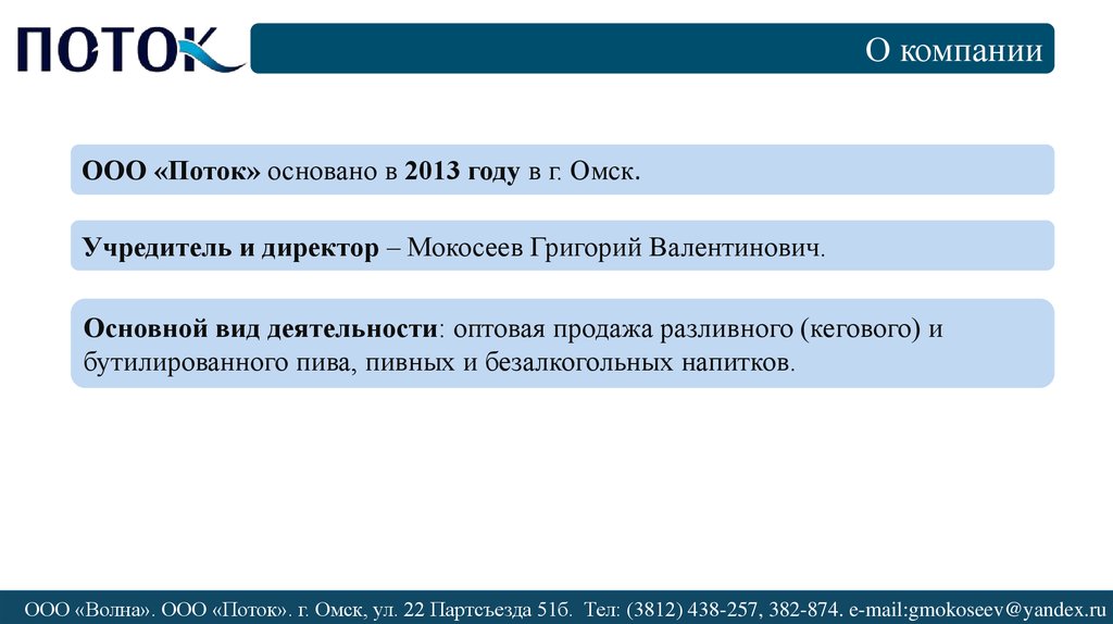 ООО «Волна». ООО «Поток». г. Омск, ул. 22 Партсъезда 51б. Тел: (3812) 438-257, 382-874. e-mail:gmokoseev@yandex.ru