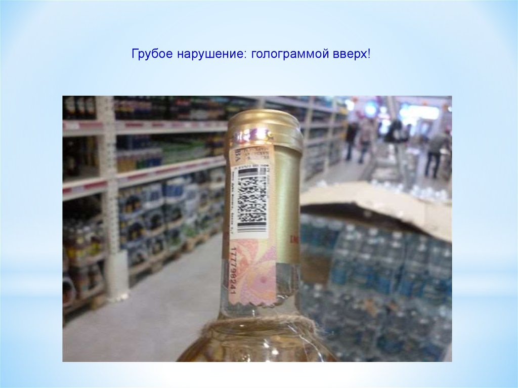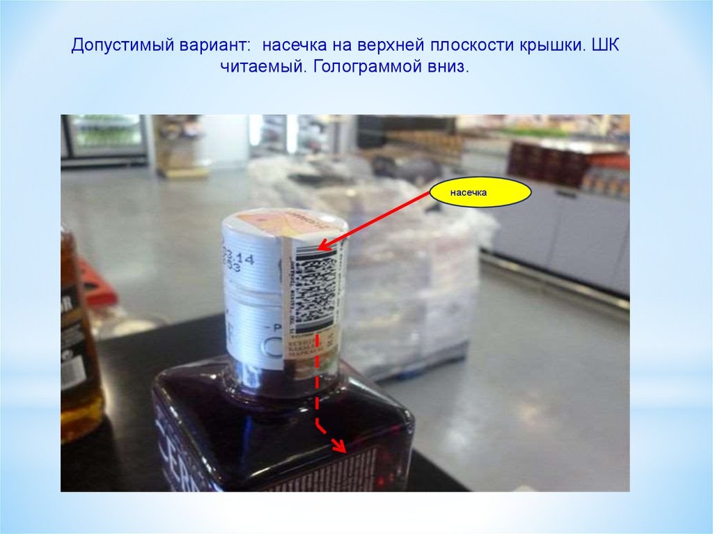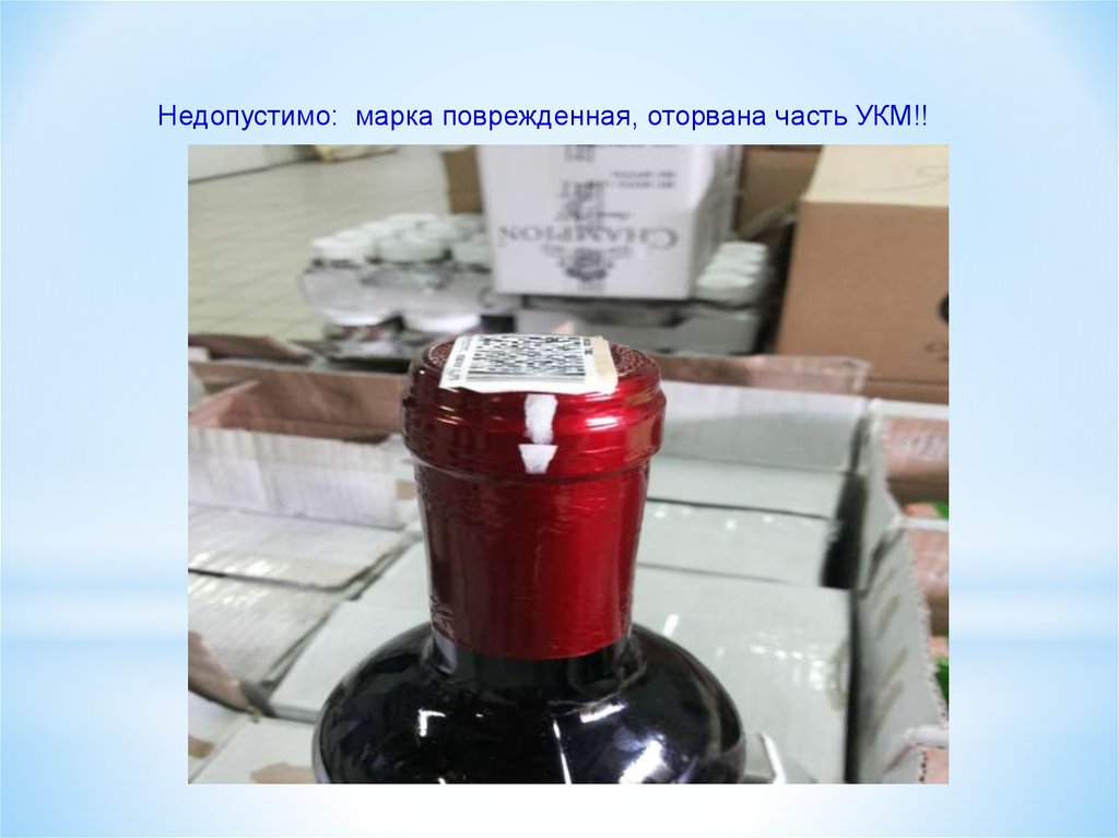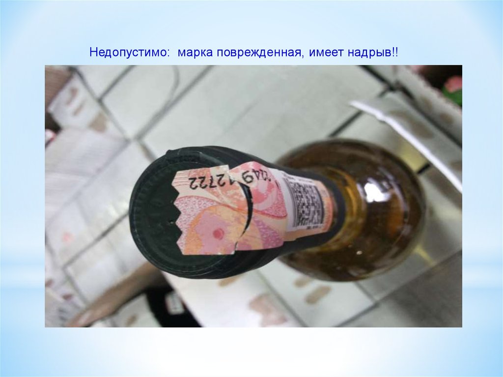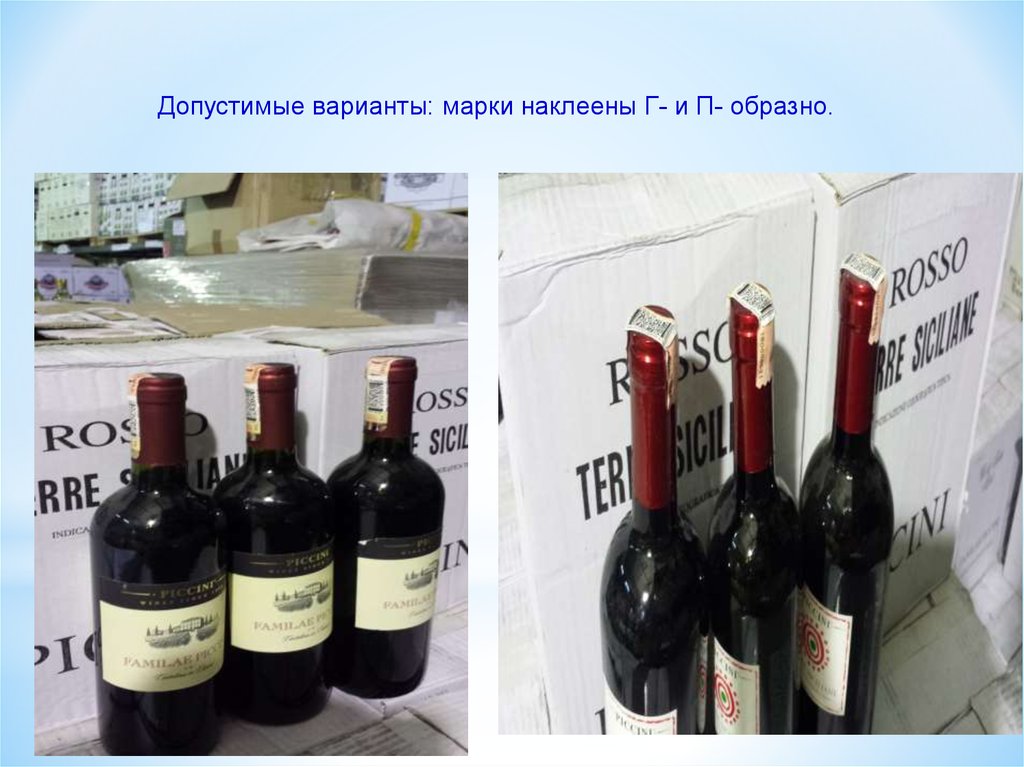 Допустимый вариант: марка наклеена с загибом на горлышке бутылки.5.