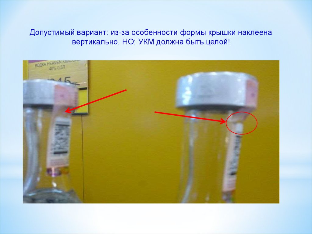 Допустимый вариант: из-за особенности формы крышки наклеенавертикально. НО: УКМ должна быть целой!