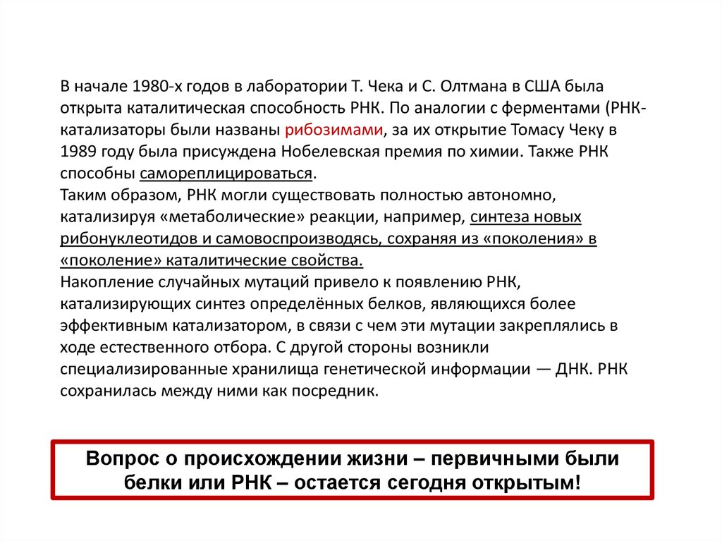 В начале 1980-х годов в лаборатории Т. Чека и С. Олтмана в США былаоткрыта каталитическая способность РНК. По аналогии с ферментами (РНКкатализаторы были названы рибозимами, за их открытие Томасу Чеку в