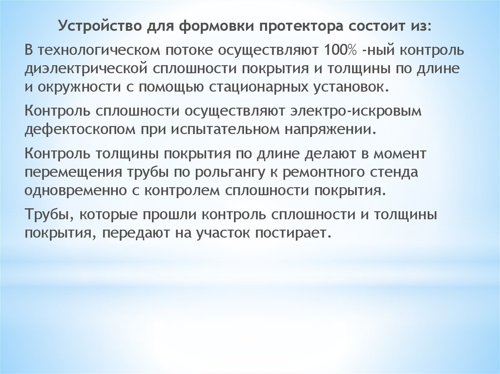 Устройство для формовки протектора состоит из:В технологическом потоке осуществляют 100% -ный контроль