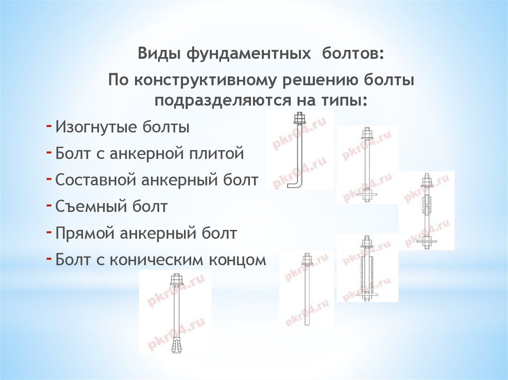 Виды фундаментных болтов:По конструктивному решению болты