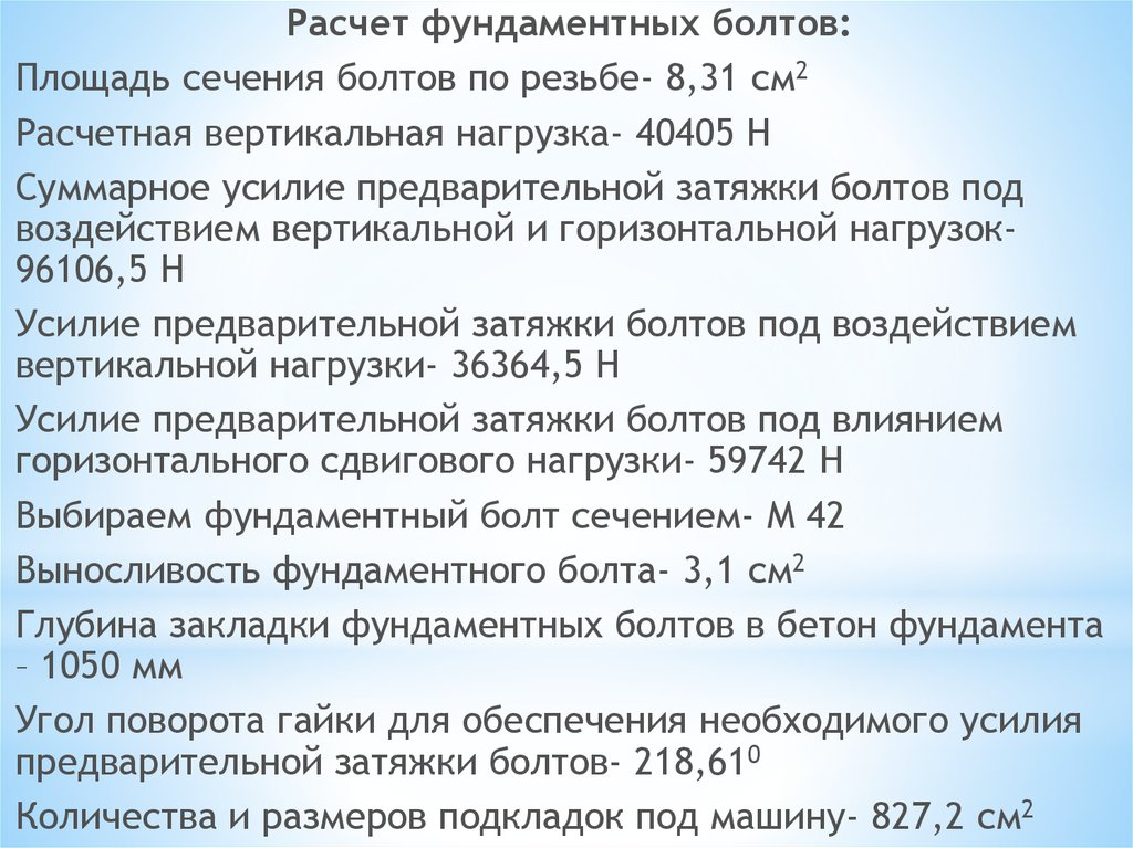 - рассчитан диаметр фундаментных болтов, который составляет М 42;