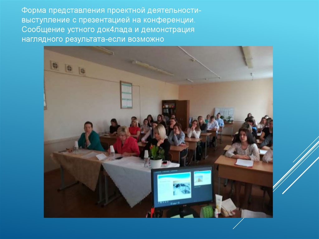Форма представления проектной деятельностивыступление с презентацией на конференции.Сообщение устного док4лада и демонстрация