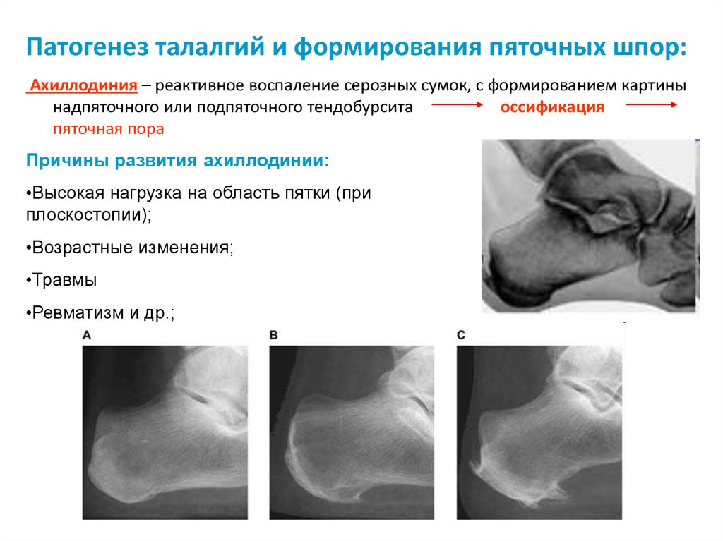 Патогенез талалгий и формирования пяточных шпор:Ахиллодиния – реактивное воспаление серозных сумок, с формированием картины