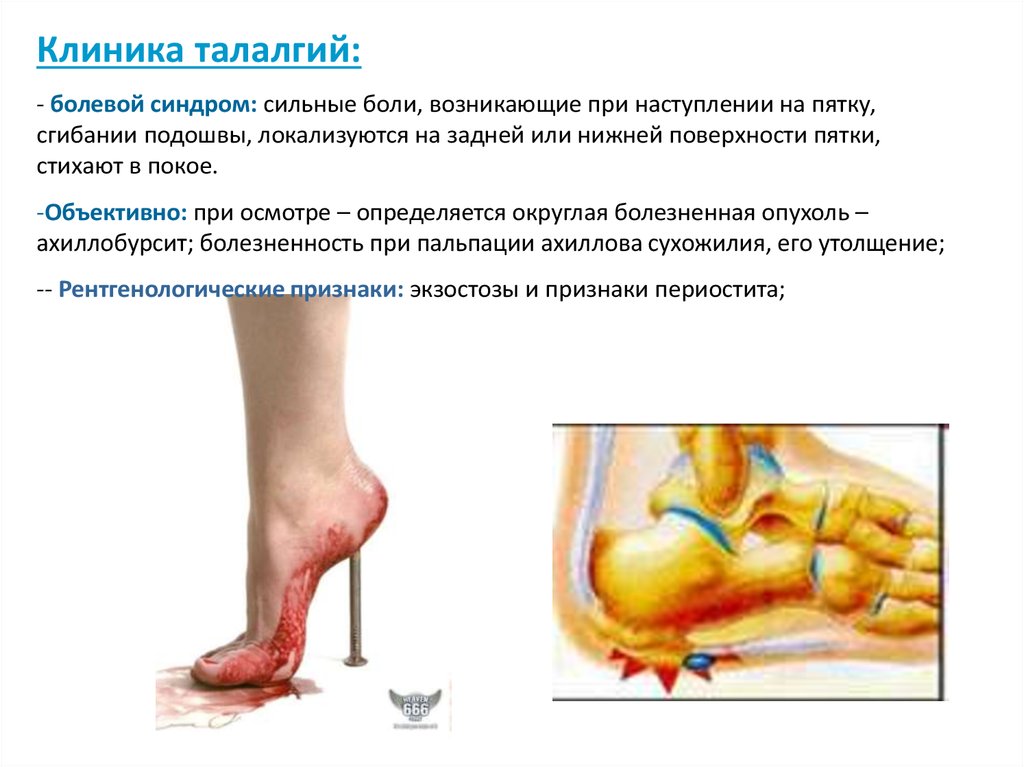 Клиника талалгий:- болевой синдром: сильные боли, возникающие при наступлении на пятку,