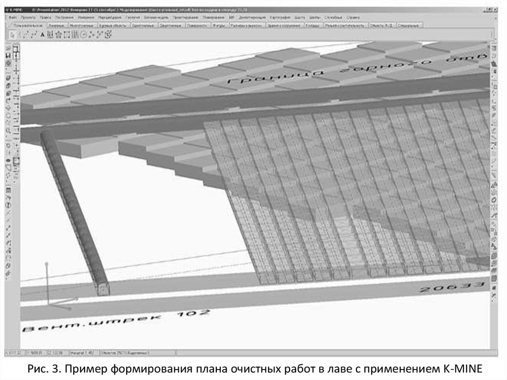 Рис. 3. Пример формирования плана очистных работ в лаве с применением K-MINE