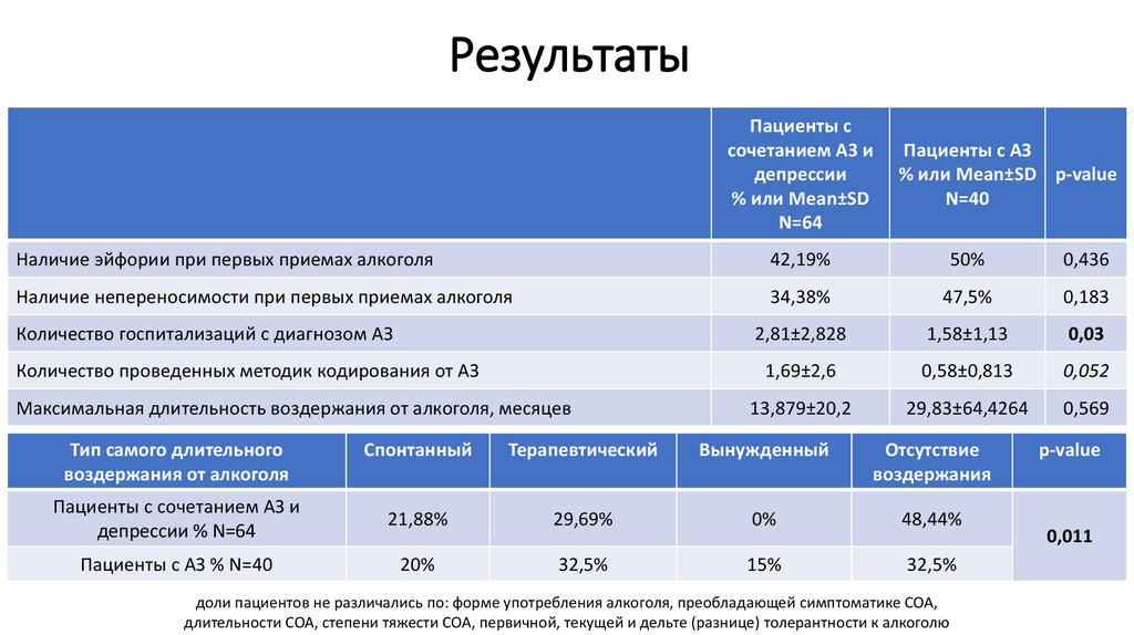 доли пациентов не различались по: форме употребления алкоголя, преобладающей симптоматике СОА,