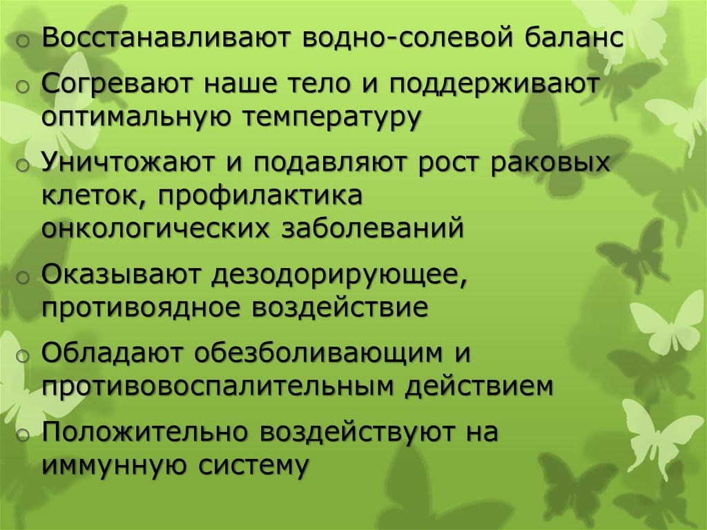 o Восстанавливают водно-солевой балансo Согревают наше тело и поддерживают