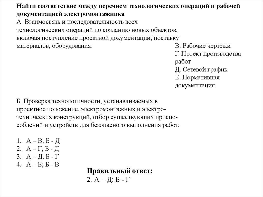 Найти соответствие между перечнем технологических операций и рабочейдокументацией электромонтажника