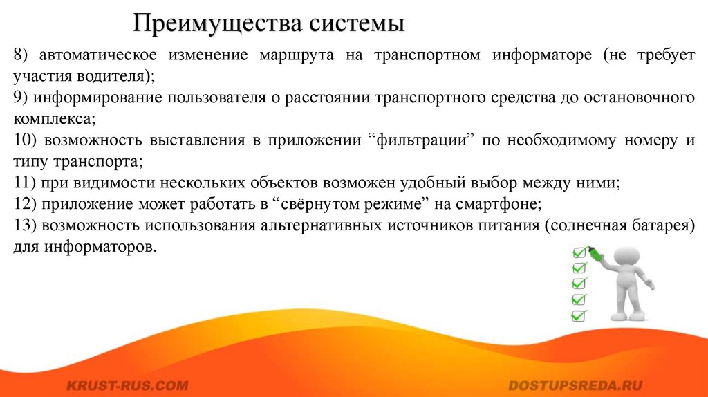 Преимущества системы8) автоматическое изменение маршрута на транспортном информаторе (не требует