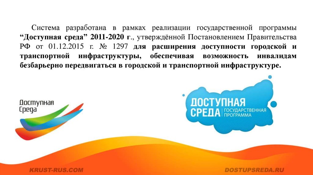 Система разработана в рамках реализации государственной программы“Доступная среда” 2011-2020 г., утверждённой Постановлением Правительства