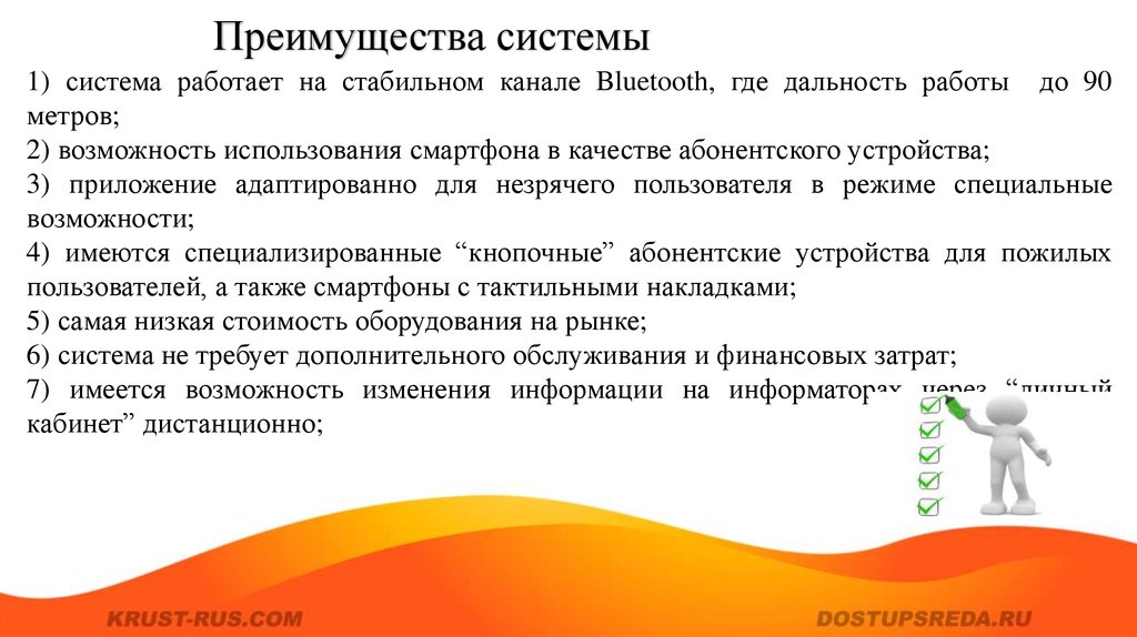 Преимущества системы1) система работает на стабильном канале Bluetooth, где дальность работы до 90