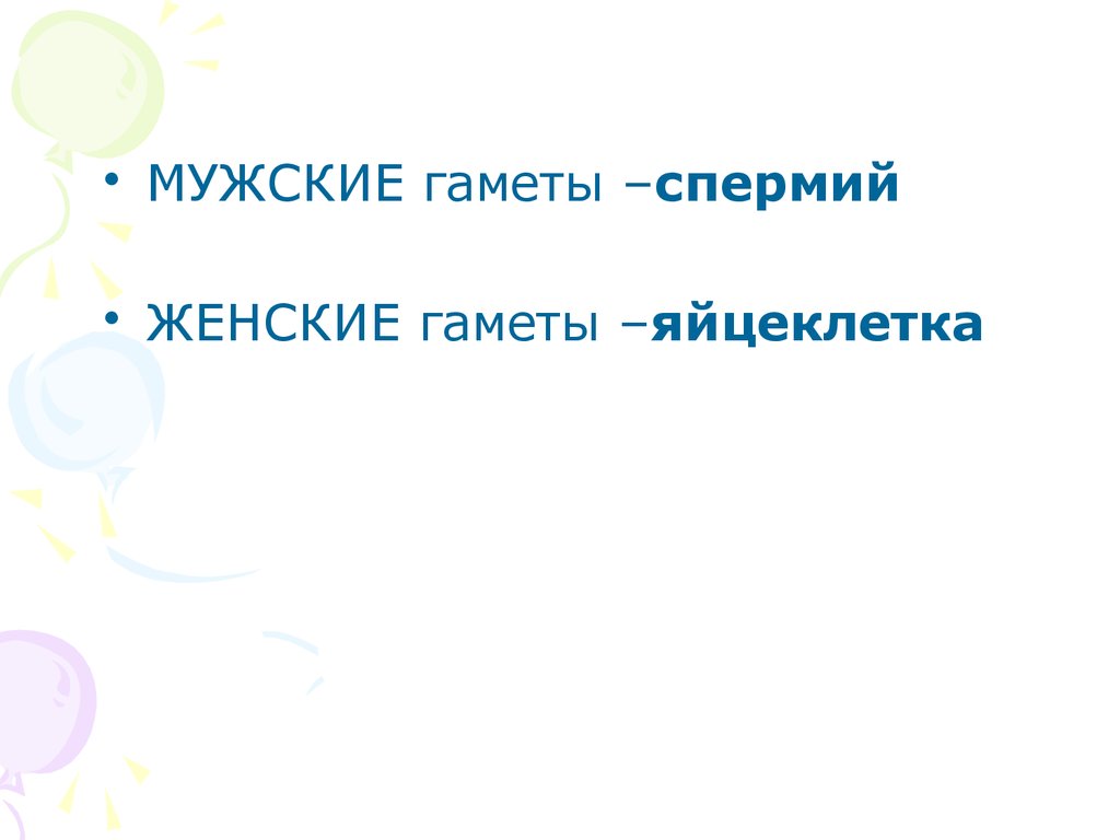• МУЖСКИЕ гаметы –спермий• ЖЕНСКИЕ гаметы –яйцеклетка