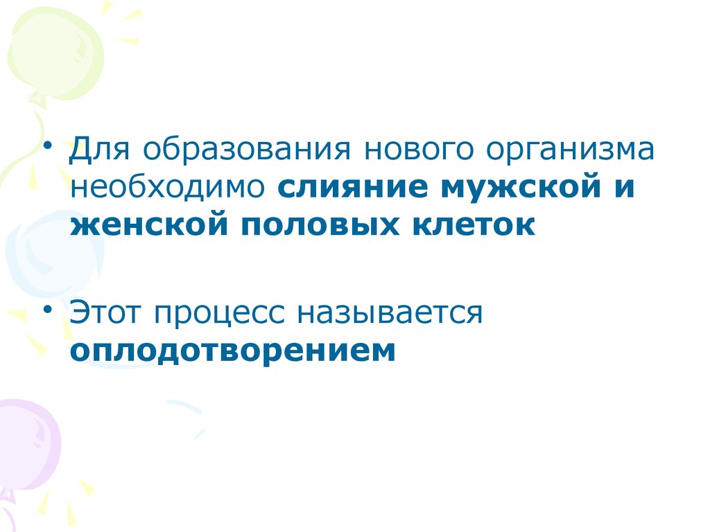 • Для образования нового организманеобходимо слияние мужской и