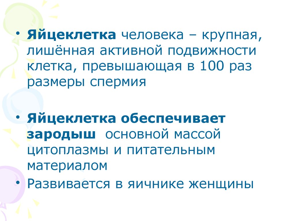 • Яйцеклетка человека – крупная,лишённая активной подвижности