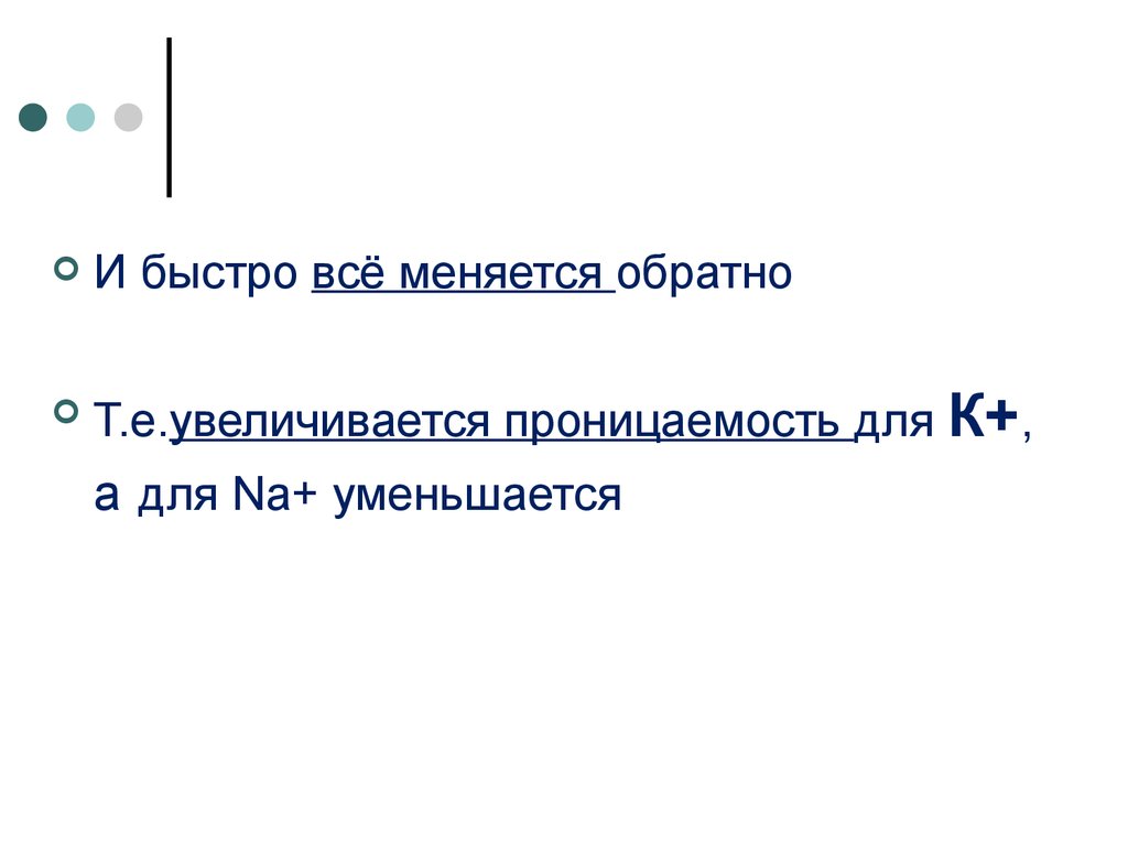 И быстро всё меняется обратноТ.е.увеличивается проницаемость для К+,