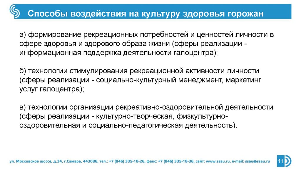 Способы воздействия на культуру здоровья горожана) формирование рекреационных потребностей и ценностей личности в